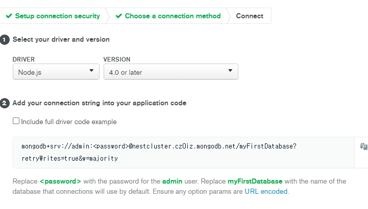 그 후 password 자리에 처음에 Database Access에서 설정한 비밀번호를 넣는다.