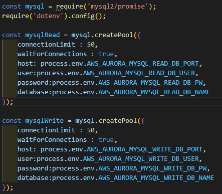 const mysqlMultiRead = mysql.createPool({ connectionLimit : 50, waitForConnections : true, host: process.env.AWS_AURORA_MYSQL_READ_DB_PORT, user:process.env.AWS_AURORA_MYSQL_READ_DB_USER, password:process.env.AWS_AURORA_MYSQL_READ_DB_PW, database:process.env.AWS_AURORA_MYSQL_READ_DB_NAME, multipleStatements : true }); module.exports = awsAuroraMysqlCreatePool = { mysqlRead, mysqlWrite, mysqlMultiRead }