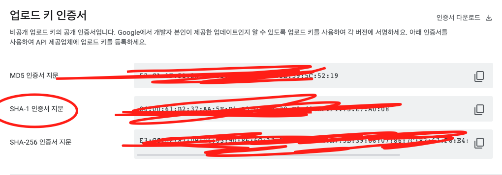 플레이스토어 내앱 -> 설정 -> 앱 무결성에 들어가면 SHA1 인증서 지문이 보인다.