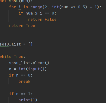 여튼 for문을 돌려 만약 함수 sosu(i)가 True를 반환하면